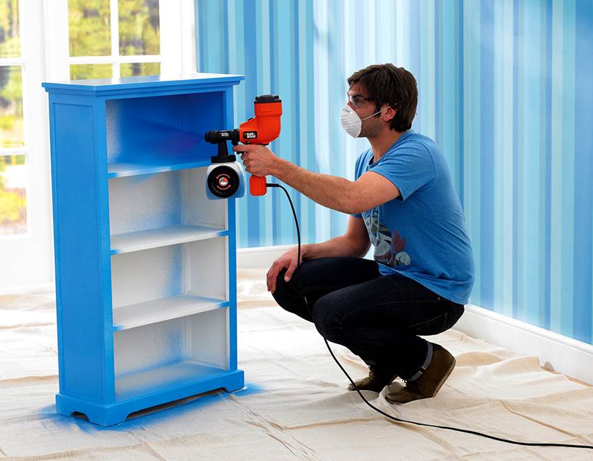 Покраска акриловой краской поверхности может выполняться при помощи краскопульта, который обеспечит равномерное нанесение состава, образуя однородное покрытие без потеков и дефектов. Краситель в этом случае наносится тонким слоем. Такая технология позволяет существенно сократить не только расход материала на выполнение работ, но и количество времени. Однако при использовании краскопульта следует обеспечить определенную вязкость красящего состава.