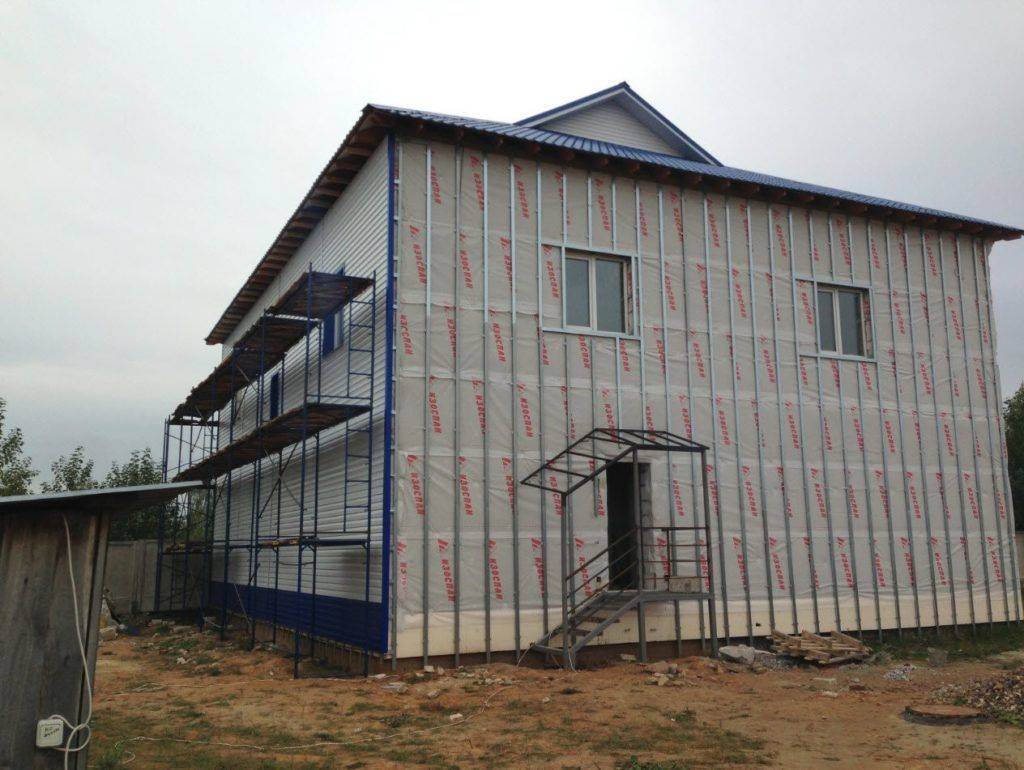 Если существует необходимость в утеплении дома, то теплоизоляционный материал (например, минеральная вата) укладывается между направляющими. Подобные утеплители необходимо защищать от проникновения влаги специальной пленкой. После этого монтируют еще один ярус обрешетки. Воздушная прослойка в пределах 2 см между отделочным материалом и теплоизоляцией необходима для отвода влаги.