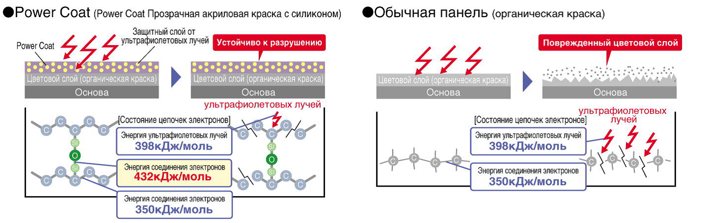 Продвинутая нано технология гидрофильного покрытия смывает грязь, скопившуюся на панели, с помощью дождевой воды. После смывания грязи дождевой водой оставшаяся влага остается на гидрофильном покрытии. Цветовое покрытие всегда защищено от влаги.