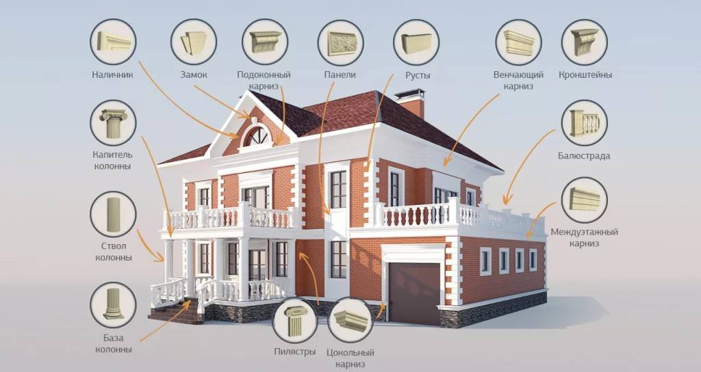 Декоративные элементы фасада изготавливаются из самых разных материалов, здесь же рассмотрим самые популярные варианты.