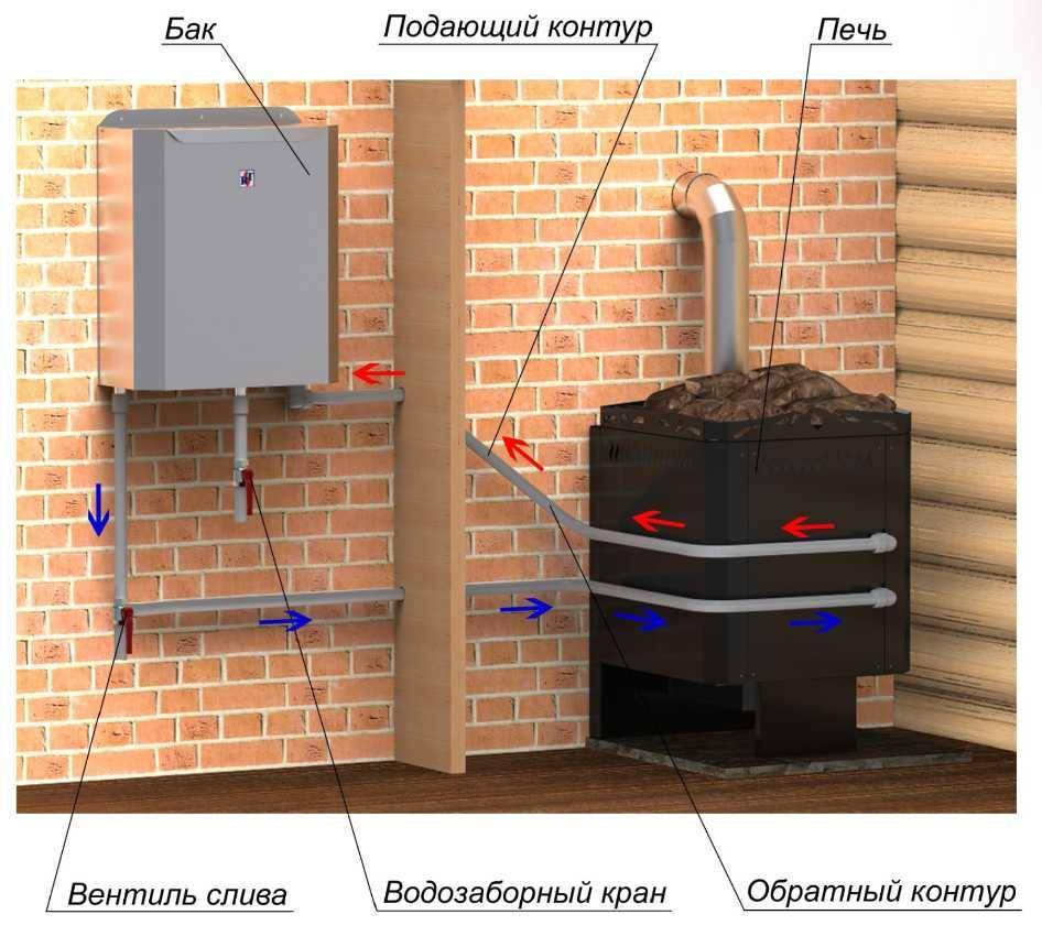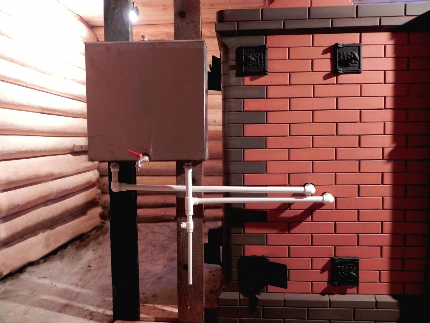Схемы подключения резервуара с водой могут отличаться. При наличии в помещении водопровода необходимо использовать систему водоснабжения закрытого типа. Для такой цели целесообразнее всего использовать печь, у которой имеется змеевик, и который, в свою очередь, будет подключаться к водному резервуару и нагревать жидкость. Саму емкость можно оборудовать на стене. Иногда резервуары монтируются прямо над печами, но при таком варианте установки лучше всего использовать более лёгкие и небольшие конструкции. Для емкостей, у которых имеется водяной контур, часто используется нержавейка или оцинкованная жесть.
