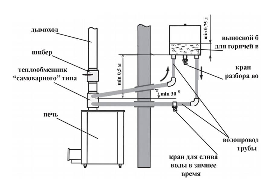 Сами мы считаем оптимальной систему, в которой резервуар крепится на дымоходе. А будет это большой бак или теплообменник – зависит от того, как вам привычнее или удобнее мыться. Ну, или от того, будет в системе насос или нет.