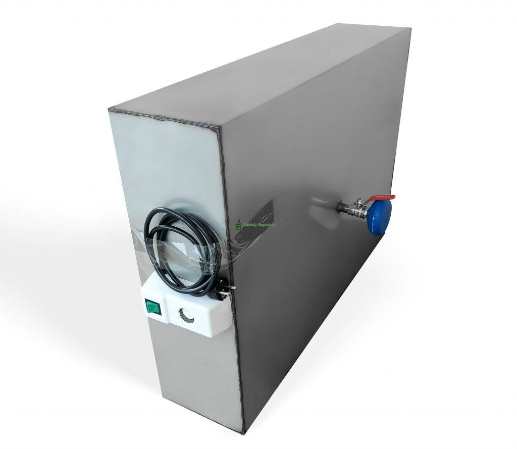 Выносные баки для воды в баню отличаются тем, что их можно расположить в любом месте, как правило — в моечной. Это связано с тем, что нагрев осуществляется при помощи теплообменника, расположенного в печи, который сообщается с емкостью при помощи системы медных и латунных труб.
