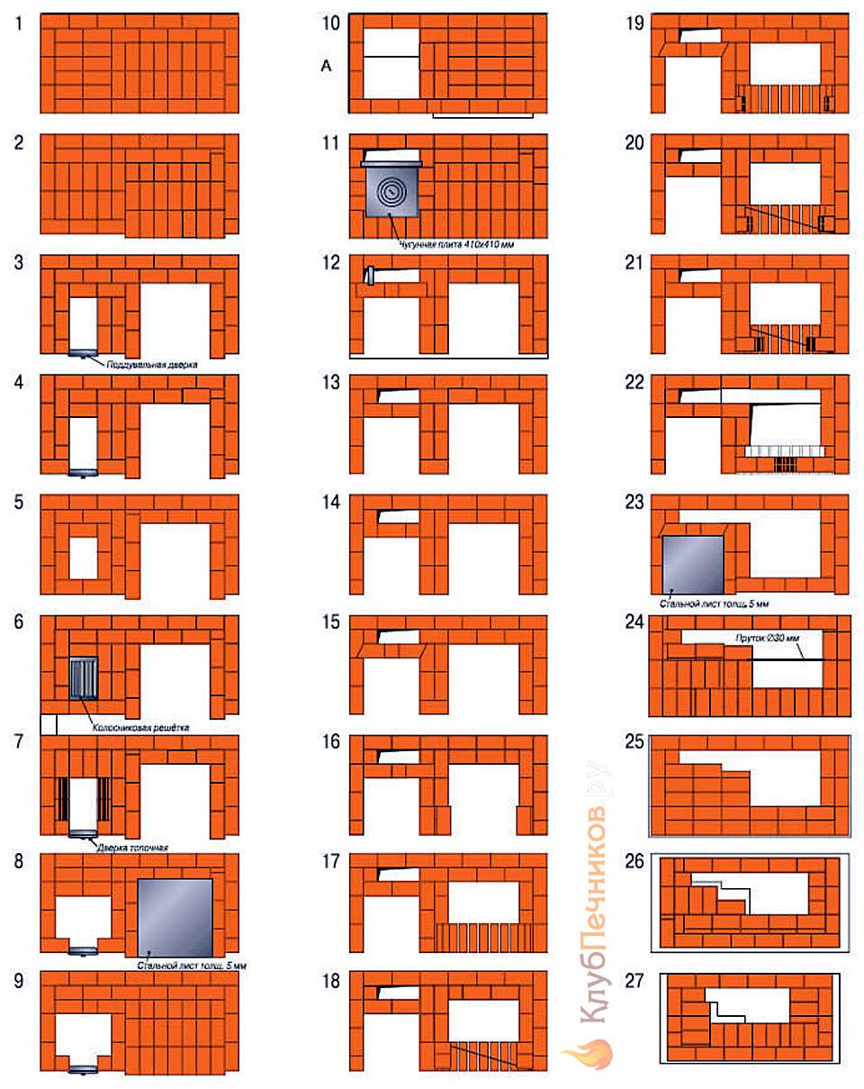 Такая модель доступна для возведения даже новичку, при условии, если работа будет производиться без спешки и аккуратно, с постоянным контролем ровности стен и соблюдением порядовой схемы. Будьте уверены, даже если вы все делаете своими руками, но очень тщательно проверяете — результат будет как у первоклассного мастера-печника!