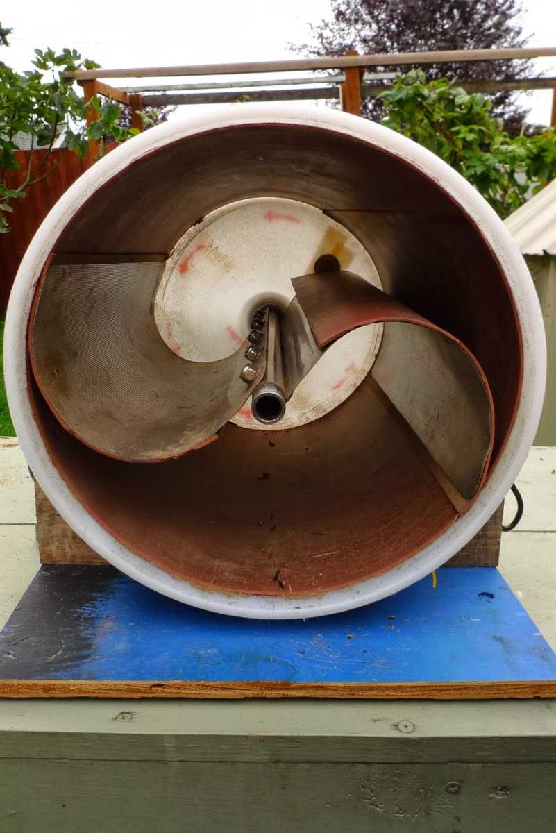В такой конструкции необходимо емкость герметично закрыть крышкой. Через дно и крышку бочки пропускается вал. В собранном виде емкость устанавливается на стойки станины так, чтобы ось вращения располагалась наклонно.