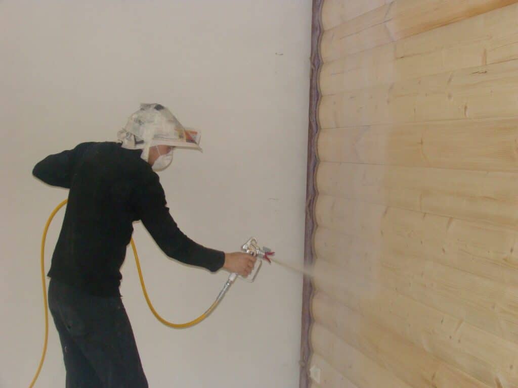 На фото показан процесс нанесения лазури с помощью распылителя. Лазури интересны тем, что могут заменить собой пропитки и лаки в комплексе. Свойства у них комбинированные, они одновременно защищают древесину и придают поверхности великолепный блеск.Лазури или, как их ещё называют, лессирующие составы бывают: