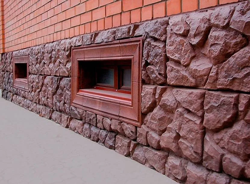 Напоминает натуральный камень внешне, но изготавливается из бетона, благодаря чему отделка цоколя этим материалом обходится гораздо дешевле, чем природным аналогом. Его положительными свойствами считается устойчивость к морозам, многообразие вариантов, влагостойкость, долговечность, небольшой вес, простота обработки и крепления.