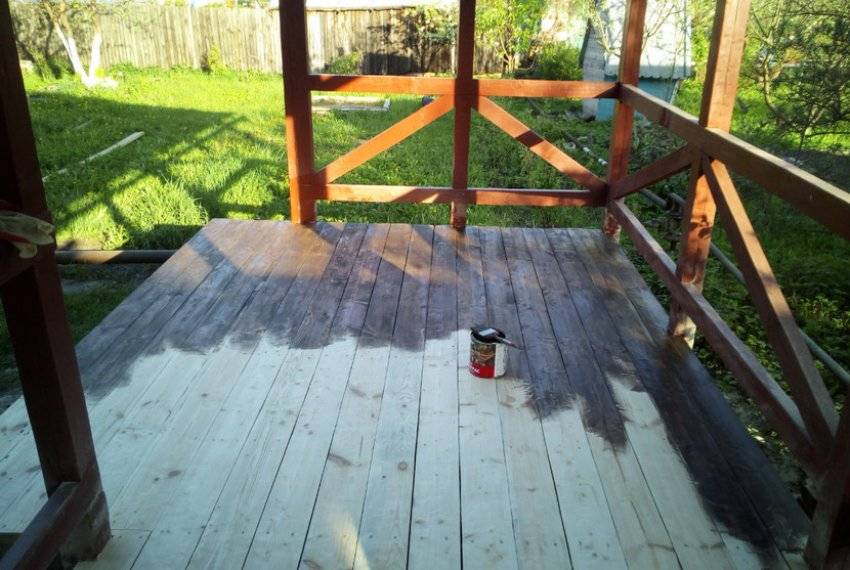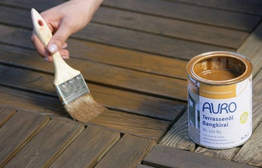Лучшим решением для открытых веранд, террас и палуб будет специальное террасное масло, которым доски обрабатывают как до, так и после укладки. В первом случае пиломатериал может сохнуть на складах несколько лет и только после этого использоваться по прямому назначению для кладки пола. Окрашивание на месте — более распространённый вариант, правда, чтобы добиться максимального успеха и продлить срок службы пола на долгие годы, стоит правильно подготовить поверхность к обработке.