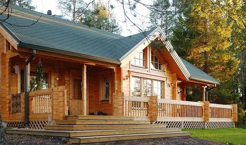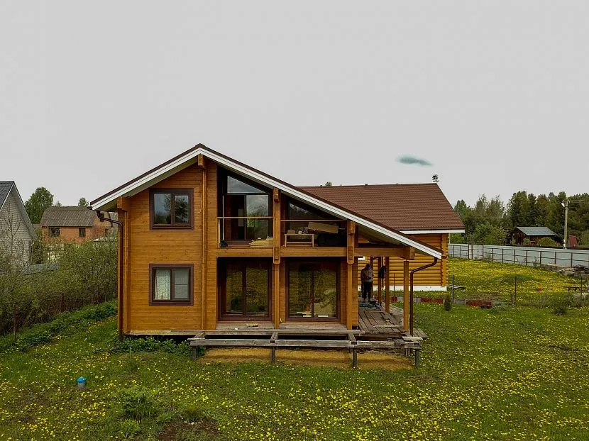 Главное при строительстве дома из дерева – обустроить надёжное водоотведение от стен строения.