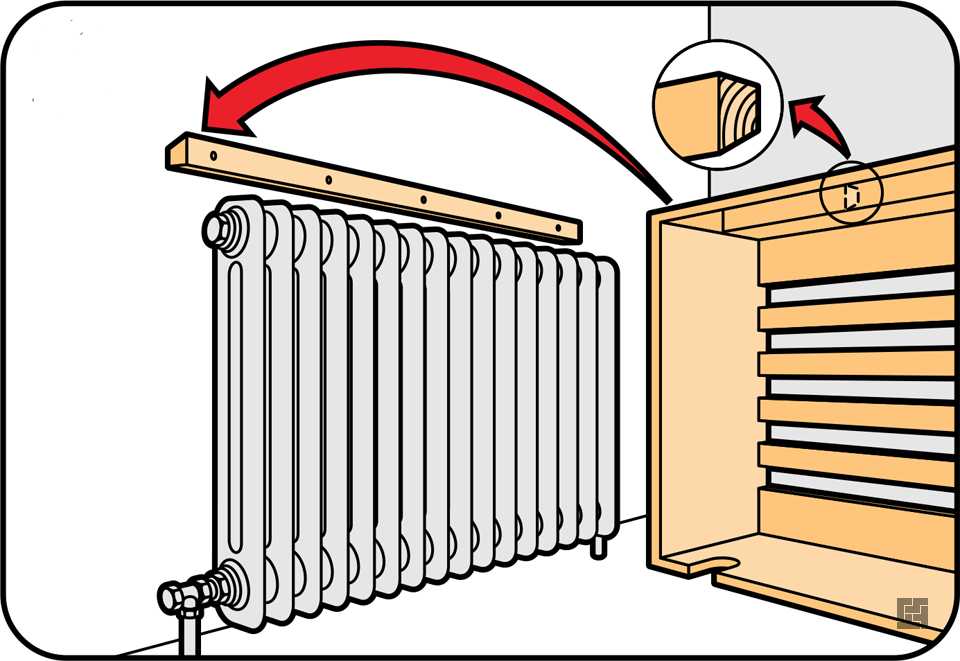 Проще всего с навесными или приставными экранами. Они снимаются/отодвигаются за секунды. А вот плоские, закрывающие радиаторы в нишах и экраны короба, которые крепятся к стене, самые проблематичные. Но и тут все решается просто. Закрепить короб к стене можно при помощи двух планок: одной на коробе, второй — на стене. Весь секрет в том, что планки верхнюю грань имеют скошенную (на рисунке видно). Та, которая прибивается на стену имеет уклон к стене, которая на коробе — скос имеет в сторону решетки. Когда короб устанавливается на место, получается что-то типа замка.
