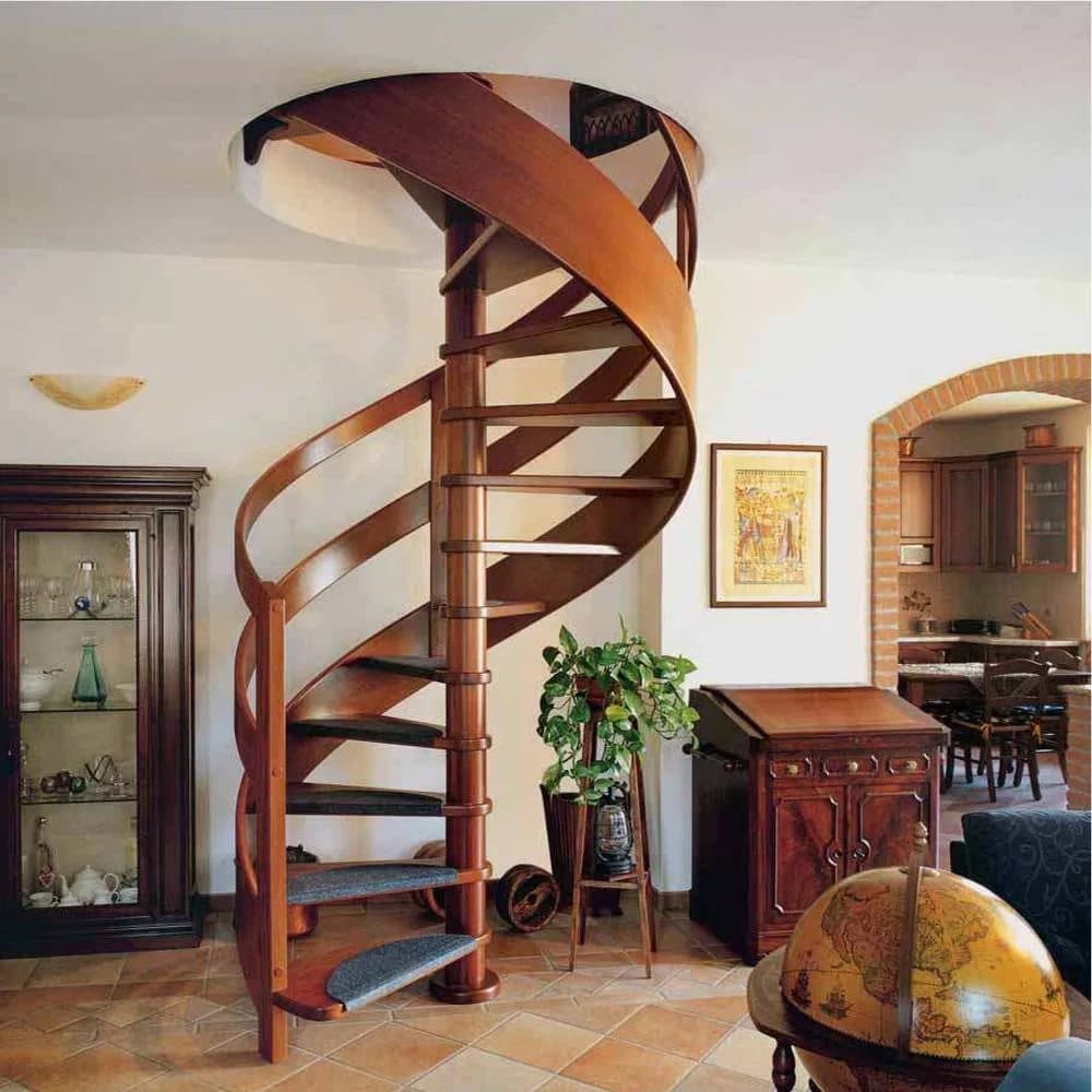 Более сложными вариантами является модульные винтовые лестницы. Сборку конструкции производят из модулей, складывая их под углом в определенной последовательности. Они бывают с центральным косоуром (ступени крепятся к модулям, а края соединяются больцами) и центральной колонной (опираются на наборную колонну, соединяются больцами). Читайте подробнее о деревянных винтовых лестницах.