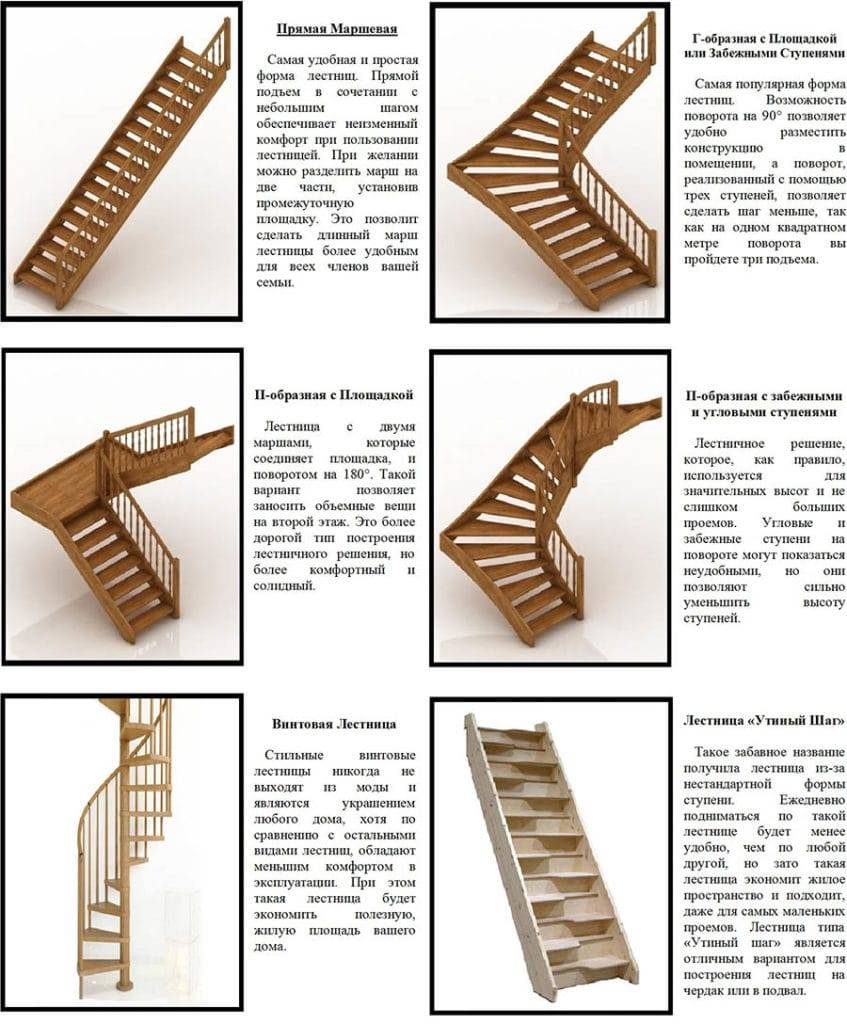 Выделяют прямые конструкции (одномаршевые и двуххмаршевые, с площадкой для отдыха). Они могут быть отдельно стоящими или размещаться около стены. Но прямые модели требуют много площади, поэтому чтобы сэкономить полезное пространство, предусматриваются двухмаршевые варианты с поворотом под углом от 90 до 180 градусов.