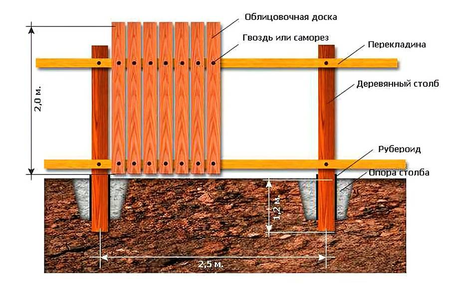 К закрепленным стойкам монтируются лаги, к которым саморезами фиксируются доски или штакетник.