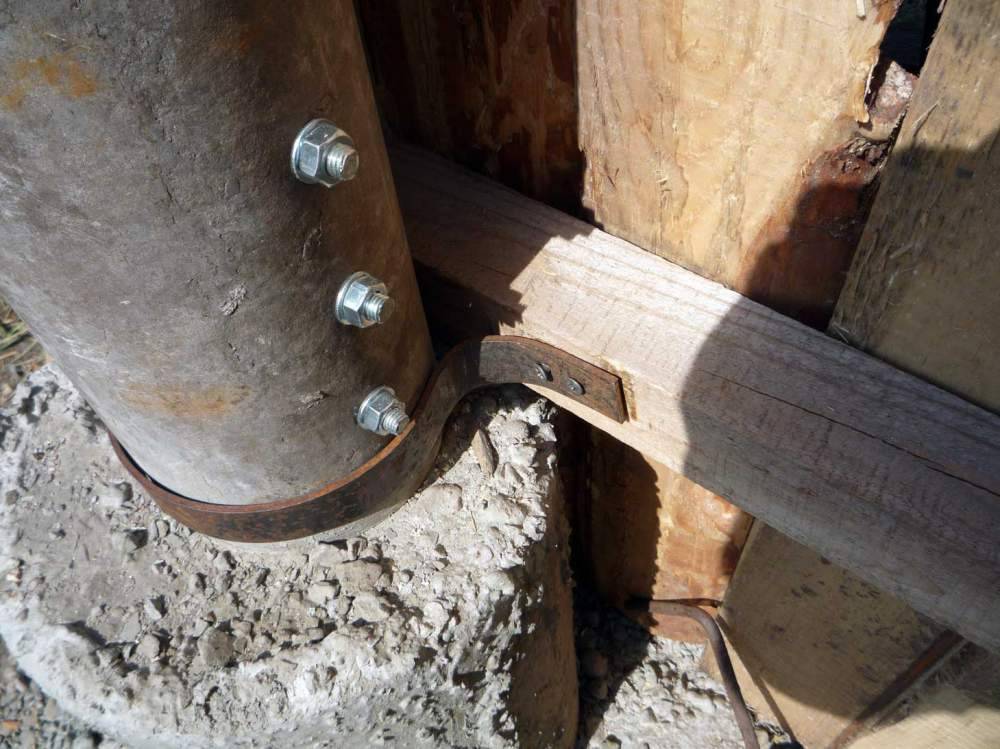 - Монтируйте слеги к столбам при помощи болтов, просверлив предварительно отверстия для них как в металле, так и в древесине. Жерди должны располагаться параллельно друг другу и перпендикулярно опорам.