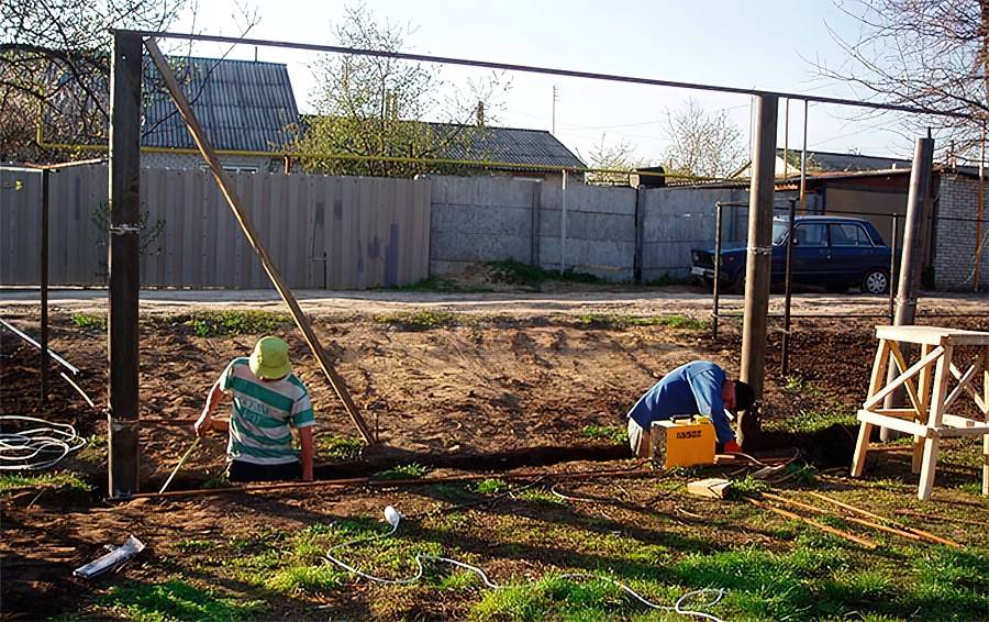 - Монтаж опорных деревянных, металлических, бетонных или кирпичных столбов с заглублением в соответствии с уровнем промерзания грунта. Можно использовать установку столбов посредством забивки в грунт, копки или бурения ям, забутовки или полноценного бетонирования.