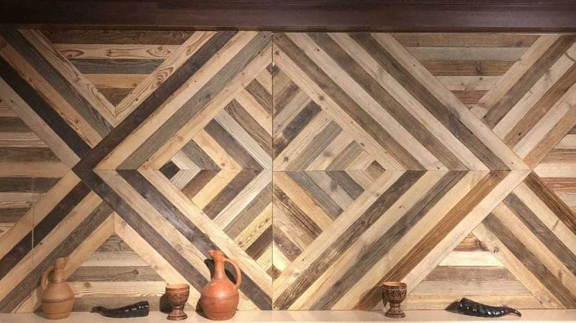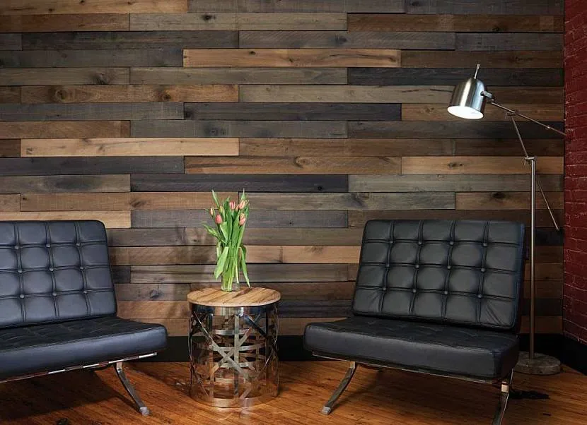 Для оформления интерьера можно использовать остатки досок: монтировать их на стену, как панно по всей поверхности. Такое решение больше подойдет для современного интерьера