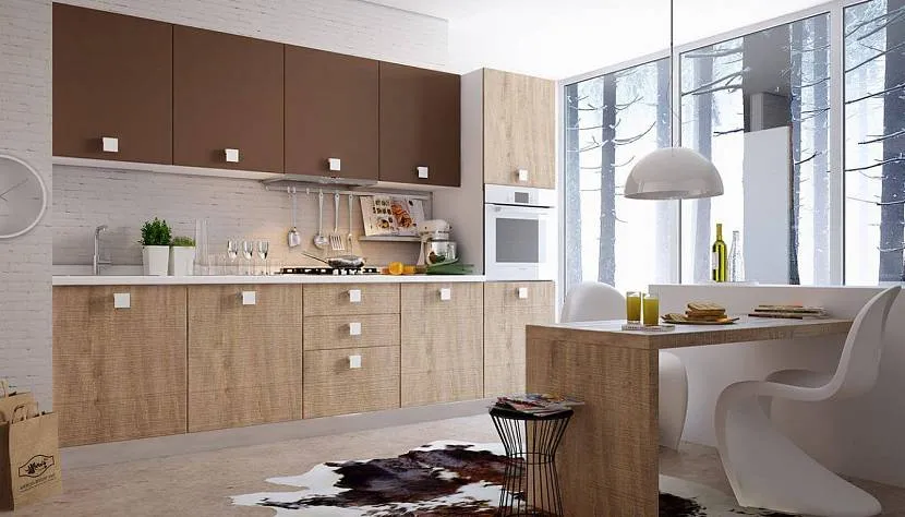 Планировка кухни с двухрядным размещением мебели считается удобной и компактной, при этом мойка и варочная поверхность размещаются вдоль одной линии, а холодильник устанавливается на другой линии. В этом случае для создания второй линии не требуется стенка: роль зонирования выполняет столешница, расположенная у противоположной стены.
