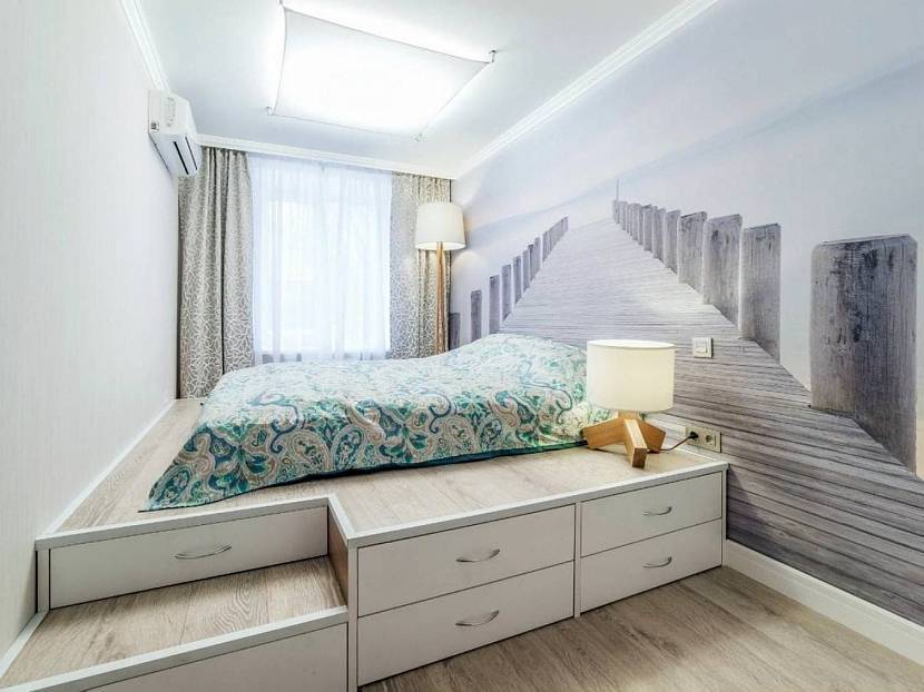 Нередко идеальным решением для небольшой спальни служит кровать, оснащенная подъемным механизмом. В нижней части такой кровати размещены вместительные ящики для хранения вещей. Размещение в спальне такой кровати решит проблему с хранением постельных принадлежностей, одеял, подушек, пледов и прочих объемных вещей.