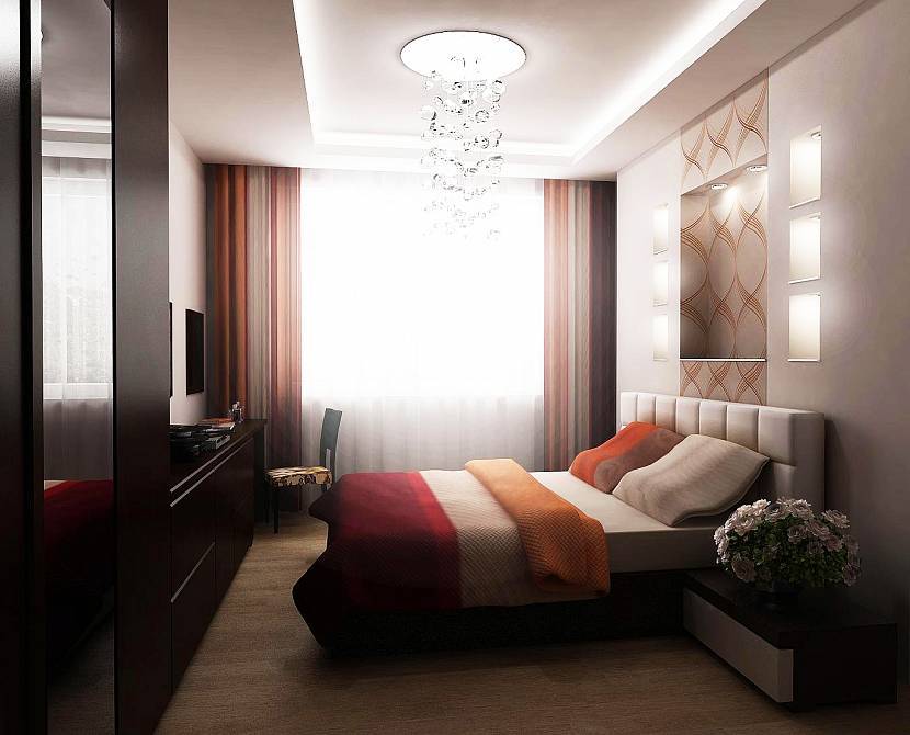 Светло-коричневая узкая спальня с нишей за изголовьемИсточник лон-дон.рф