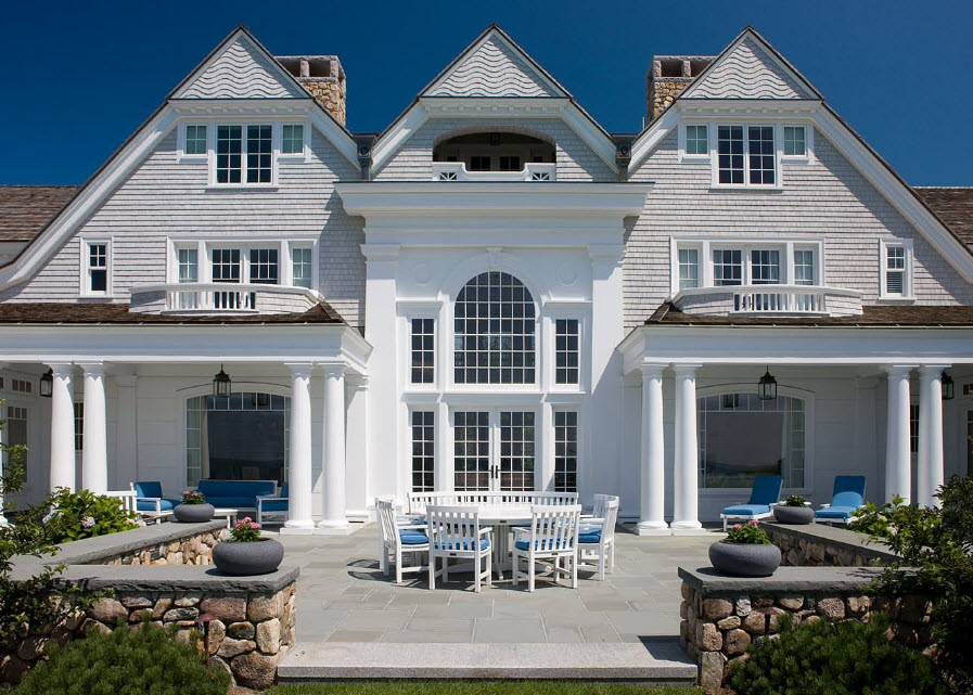 - В классическом случае строительства дома в том стиле главный фасад здания содержит в себе 5 окон.