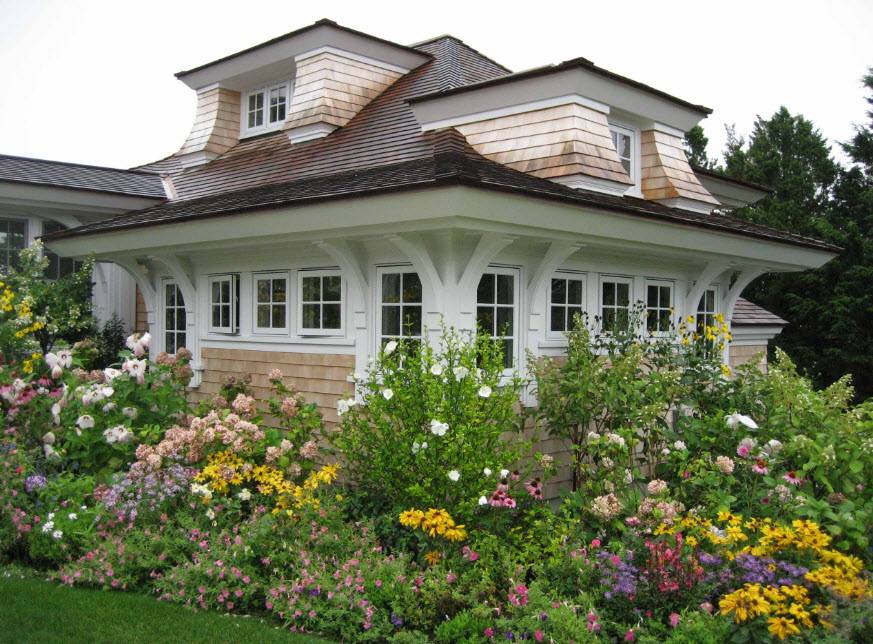 В таких домах практически отсутствует фундамент, пол настилают чуть ли не на грунтовый слой земли. Гараж не принято выставлять напоказ, поэтому его строят в середине участка. Также неприемлемо строить отдельные навесы для гаража и делать его примыкающим к стене жилого дома. Фасад домов в английском стиле отличается высокой кровлей. Наиболее популярные материалы для сооружения крыши: сланец, черепица и даже солома.