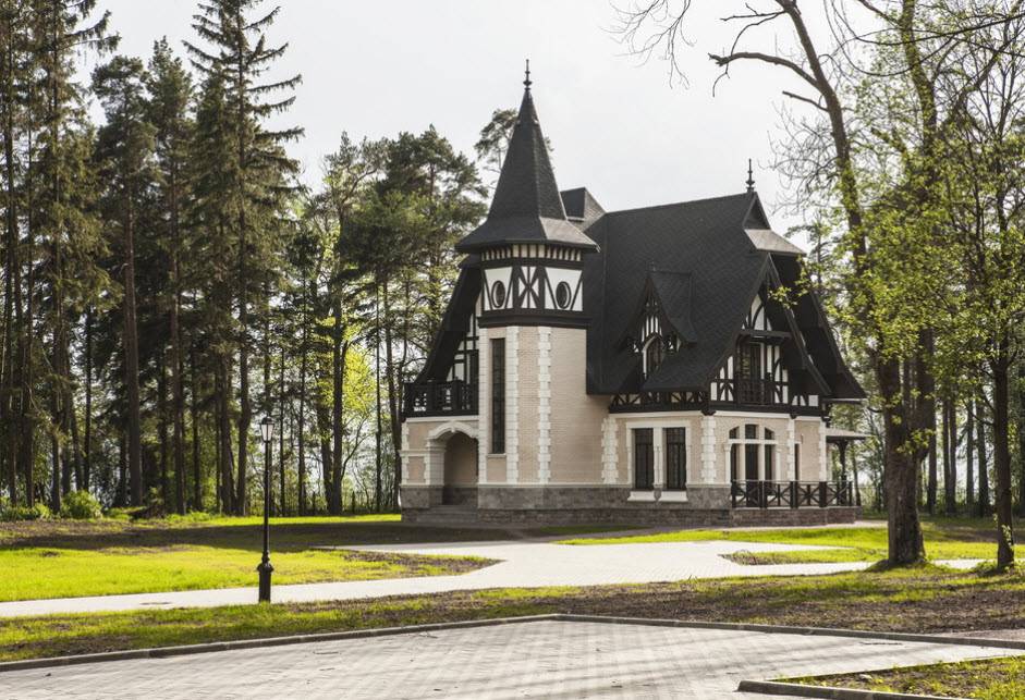 Несколько более легковесное, по сравнению с предыдущим типом, здание в стиле Тюдоров будет также отличаться кирпичной кладкой и строгим фасадом. Одним из наиболее интересных элементов, которые используются при отделке экстерьера подобного дома, будет фахверк.