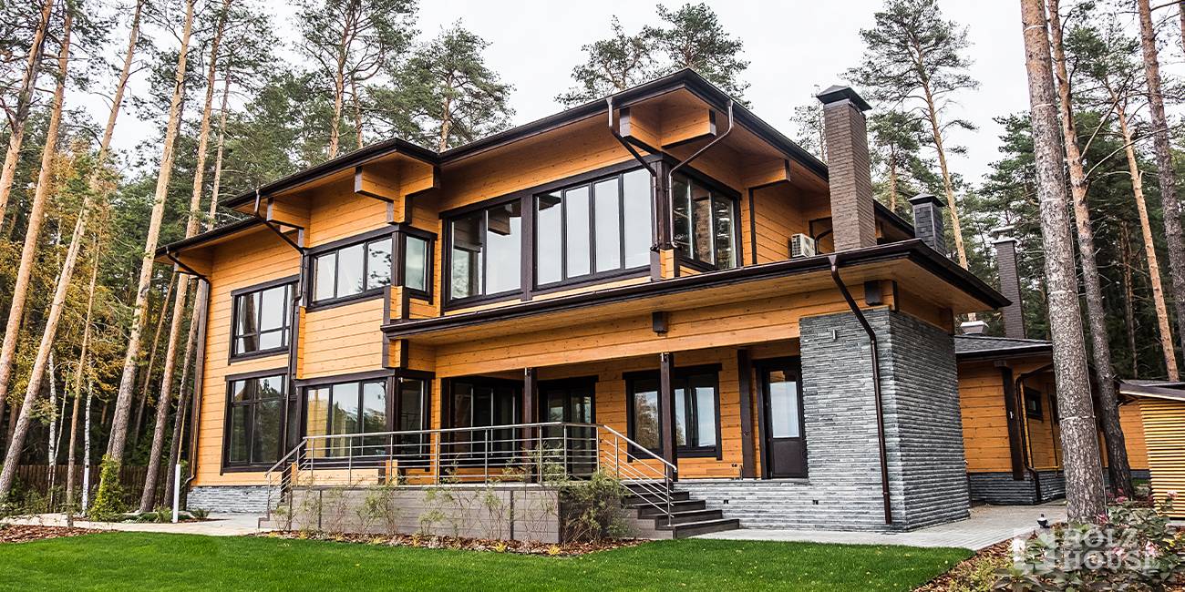 Фасад дома северного модерна в употреблении декоративных элементов графичный и сдержанный. Их основная примета — это отделка фасадов с сочетанием искусственных и естественных материалов отделки.