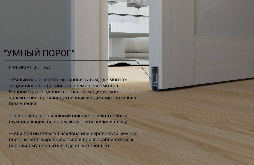 «Умный» порог изготавливают из резины. Задача данного элемента – уменьшить щель между полом и дверным полотном, обеспечив при этом легкое закрывание и открывание. Такой порог не только повышает комфорт при эксплуатации, но и заметно улучшает звукоизоляцию, становится препятствием для сквозняка.
