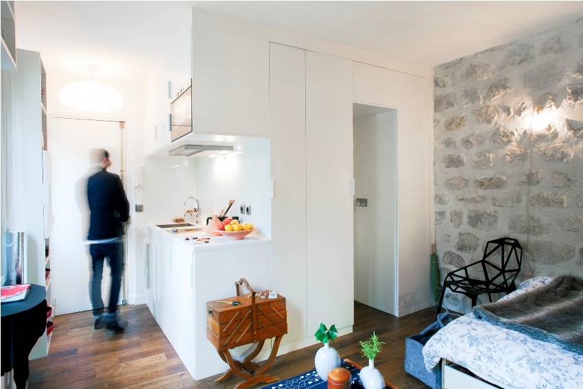 Это не позволит захламить площадь, что очень важно при ограниченном пространстве. Но дизайн студии 30 кв м и более может предполагать даже полноразмерные кухонные гарнитуры. По максимуму нужно использовать не широту, а высоту