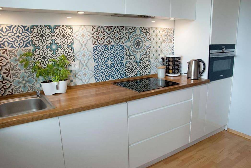Популярна отделка марокканской, глазурованной энкаустической плиткой. Это красиво и практично. Стильно и современно смотрятся расстекловки. У них геометрические орнаменты и интересные узоры, которые придадут оригинальности всему кухонному гарнитуру.
