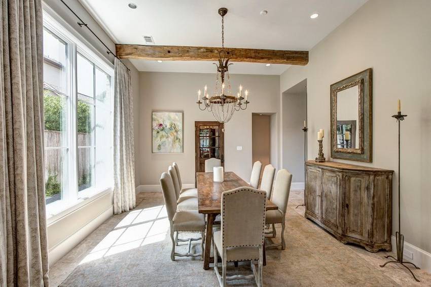 Деревянные балки на потолке не прячу под перекрытием, а оставляют на виду. У них свое декоративное предназначение. Их окрашивают в черный, коричневый, терракотовый цвет или же просто покрывают антигрибковой пропиткой и сохраняют структуру дерева.