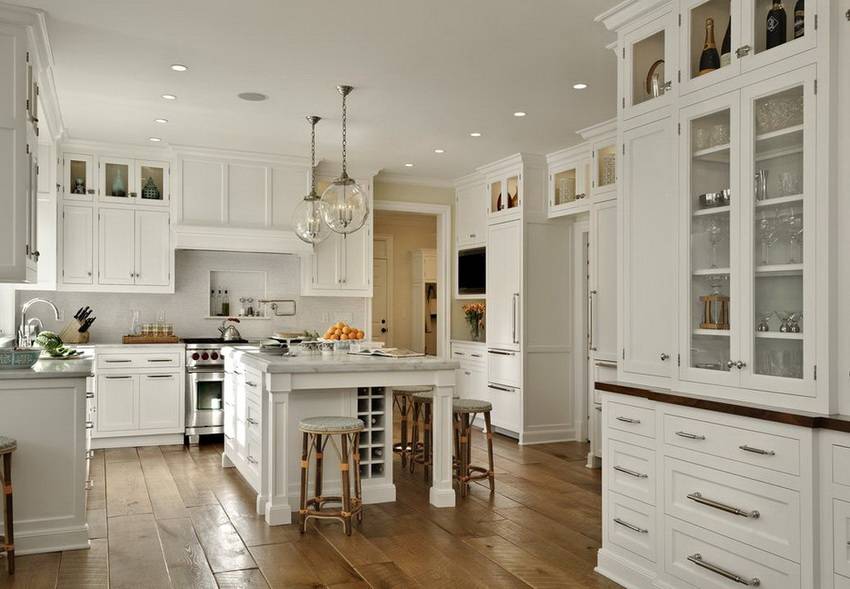 Можно выбирать тот или другой вариант, но гарнитур должен соответствовать размерам помещения. Для прованского стиля на кухне типично наличие отдельной зоны, в которой имеется шкафчик-хранилище и рабочий стол для разделки продуктов. Здесь хозяйка может без помех возиться с тестом. Но если площадь кухни маленькая, от такого «островка» придется отказаться, поскольку уменьшение пространства кухни будет создавать большие неудобства.