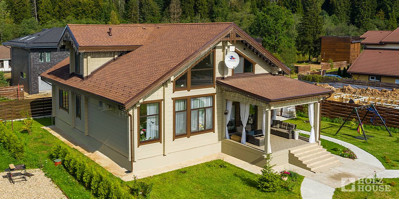 Покатые крыши, широкий козырёк, который предназначен для защиты стен и фундамента от дождей. Большая веранда порадует своим комфортом любую семью.