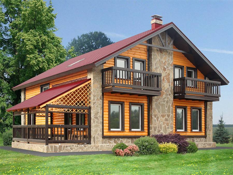 Первый этаж, обычно штукатуря, после белят, и декорируют элементами из дерева. В оформлении фасада используется брус и натуральный камень, облицовочный кирпич. Для кровли, конечный материал облицовочный используется натуральная, металочерепица, мягкая кровля.