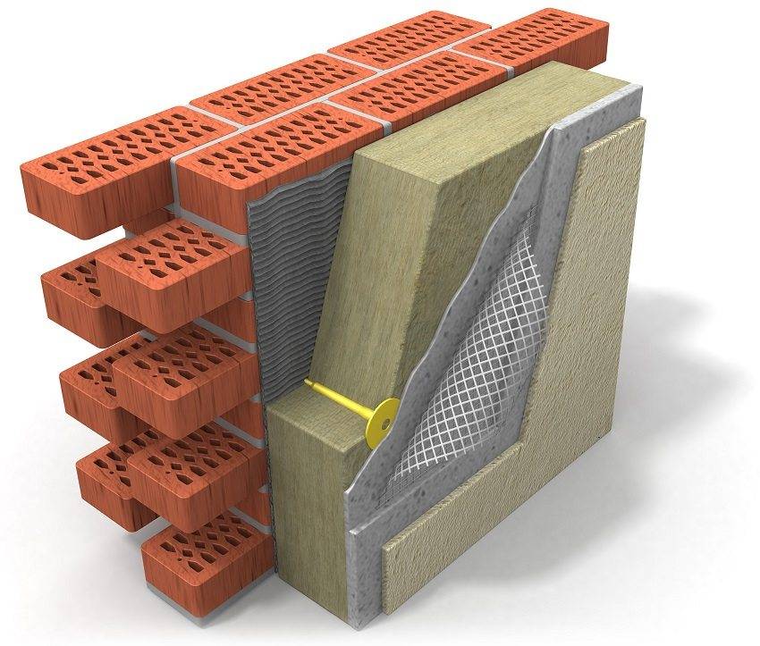 - Для начала к фасаду крепится слой минваты или пенопласта с помощью дюбелей или клея.