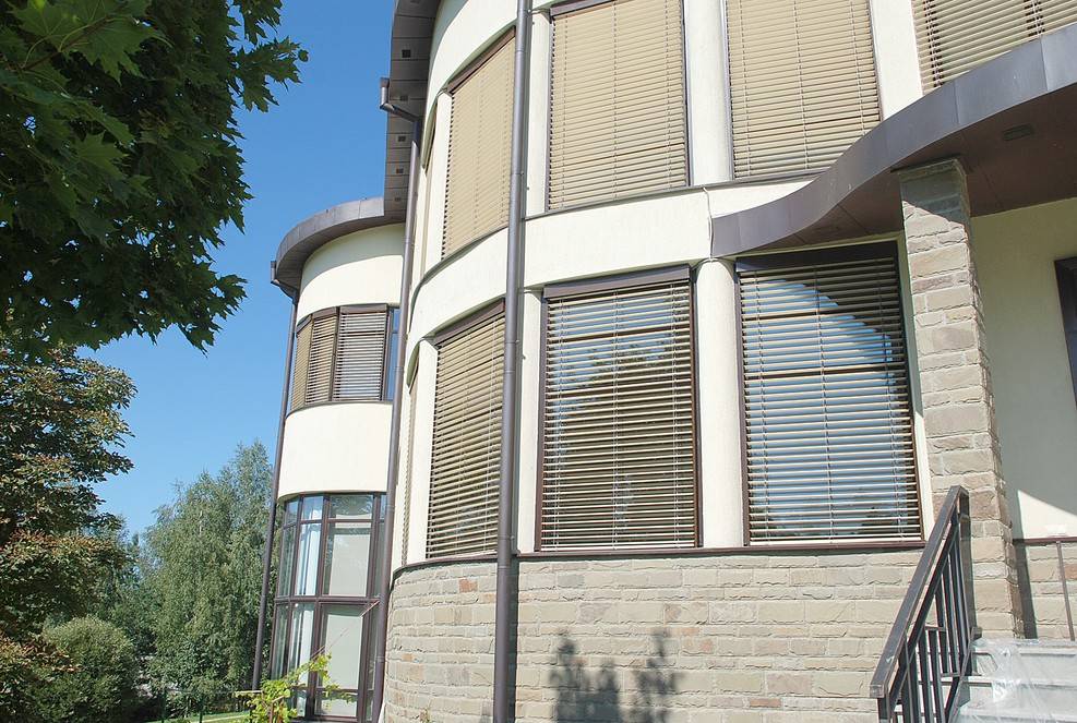 Желательно не крепить рафшторы снаружи, а «втопить» их в само здание. Так смотреться они будут естественнее и аккуратнее. Но это возможно, только если установка конструкции предполагалась в момент проектирования. Если нет, то придется просто постараться разместить рафшторы максимально органично, подобрав вариант близкий по цвету к фасаду.
