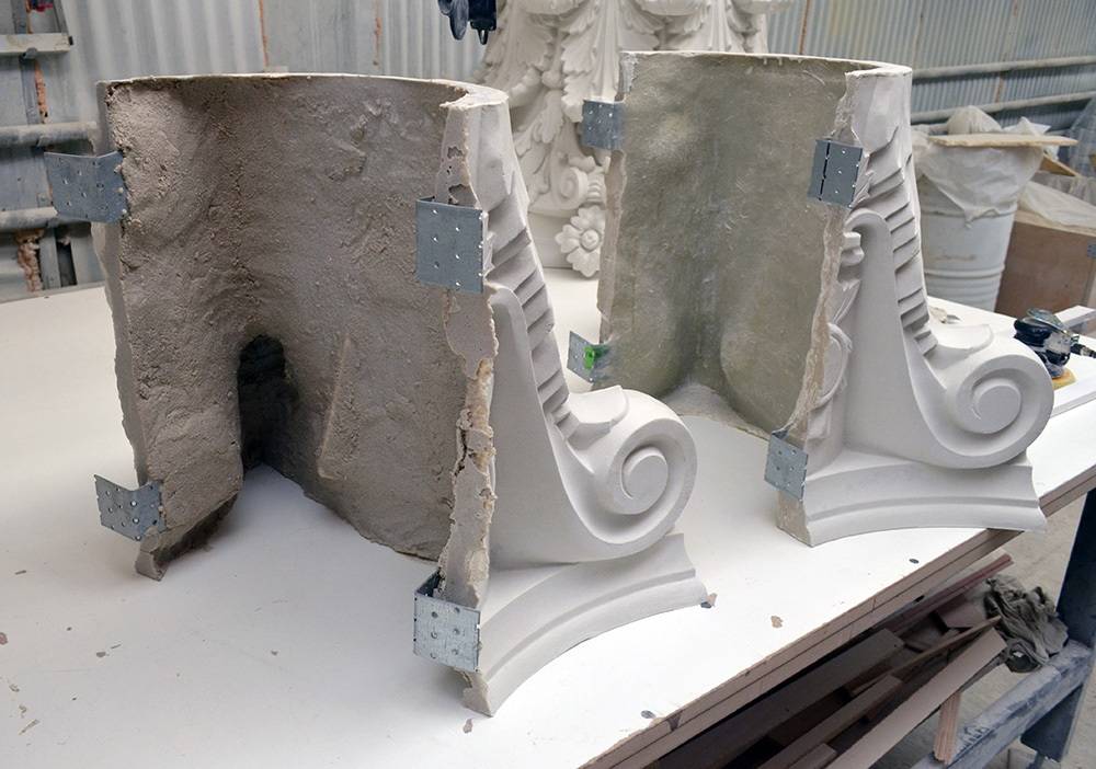 - элементы фасадного декора: карнизы, русты, колонны, пилястры, капители, кронштейны, облицовочные панели;