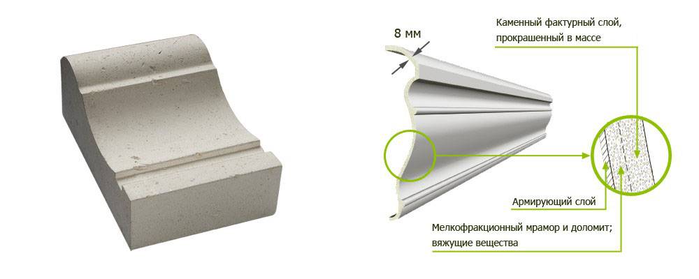 - Лицевая поверхность декора неотличима внешне и на ощупь от натурального камня и имеет фактуру мелкофракционного натурального материала, используемого для его изготовления: молотого доломита, мрамора, кварца, травертина и т.д. Весь каменный слой (глубиной 4-5 мм) имеет одинаковый прокрашенный в массе цвет и нечувствителен к мелким царапинам и сколам.