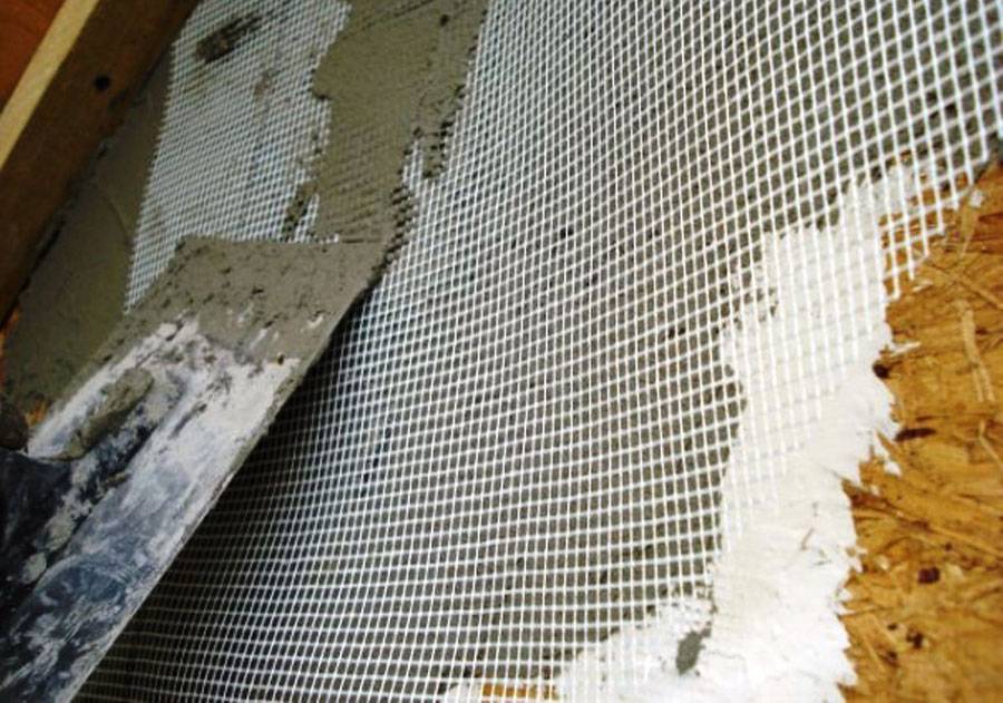 Если поверхность фасада выполнена из дерева, на всю поверхность стены следует уложить штукатурную сетку, а затем поверх нее – специальный склеивающий раствор. Также сеткой покрываются любые металлические детали экстерьера (крепления, заклады и пр.).