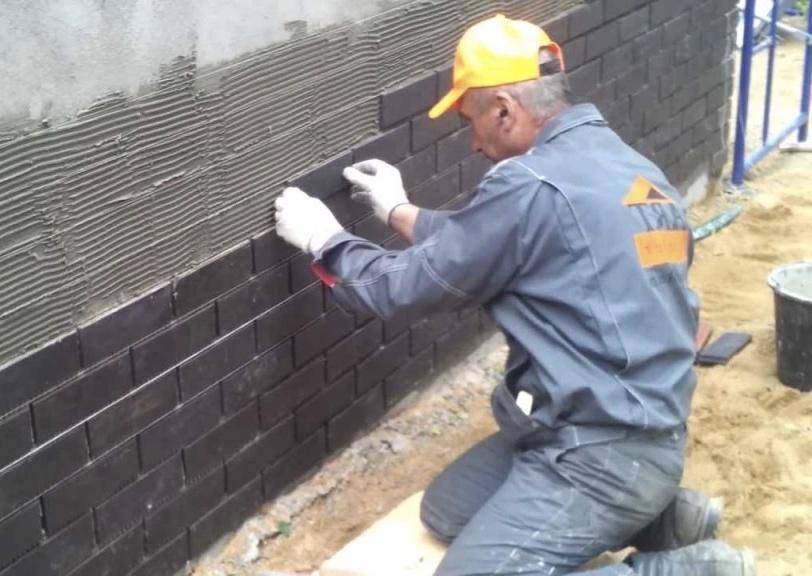 - Аккуратно бетонную плитку прижимают к поверхности фасада так, чтобы в межплиточных швах выступил клей.