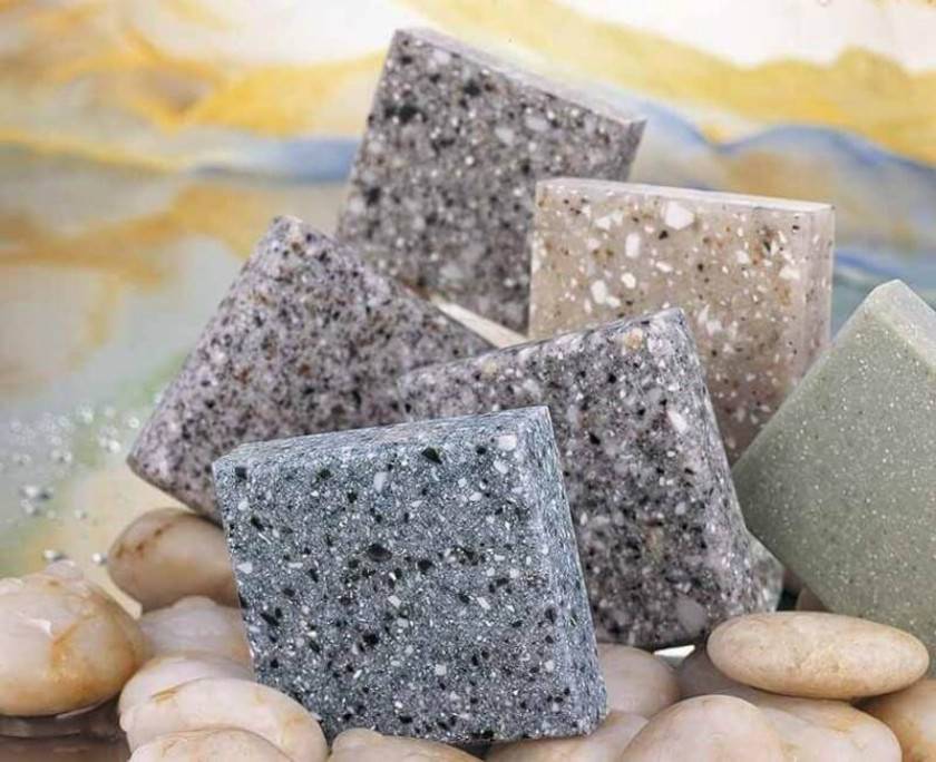Смолистые плиты на цоколь – достойная альтернатива песчано-полимерному отделочному материалу. Размер плит для цоколя и панелей на фасад, больше полимерного. Выпускается любой, в том числе и неправильной формы. Установка делается на клей, реже облицовывается вентилируемый фасад. Используется он широко в домашних интерьерах. Точно передает фактуру и рисунок натурального материала. Особенно мрамора и гранита.