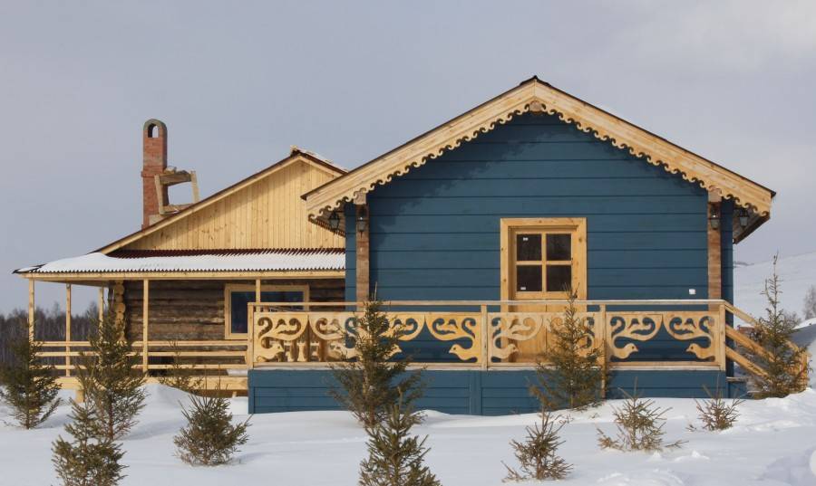 - Синий, зеленый, желтый и другие природные оттенки хорошо смотрятся на фасаде дома.