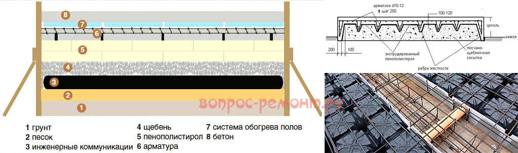 При отсутствии утепляющей прослойки в пироге плитного фундамента заложение элементов теплого пола в ходе бетонирования не имеет смысла. Львиная доля тепла в таких системах уходит на обогрев бетона и грунта, их КПД существенно снижается.
