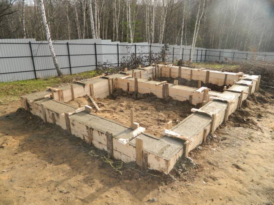 Их обязательно нужно армировать, как минимум 4-6 прутьев диаметром 12мм. Часть арматуры (15-20см) должна оставаться выше будущего уровня заливки. Затем, после застывания и схватывания фундамента, делается опалубка под ленту, которая будет идти по периметру несущих стен и перегородок.