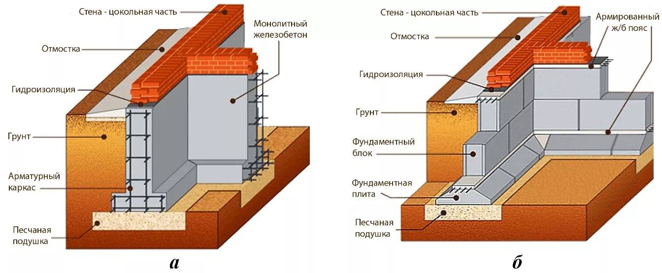 Ленточный фундамент может быть сделан из блоков ФБС или залит из бетона.