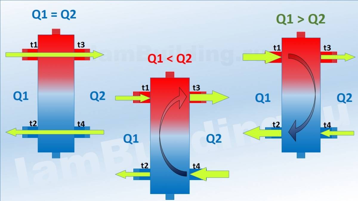 Что такое режим работы? Режим работы связан с соотношением расходов через котловой контур Q1 по отношению к расходам контура потребителя Q2. В результате может быть 3 варианта работы между контурами может быть равенство Q1=Q2, Расход котлового контура может быть меньше чем в контуре потребителе Q1<Q2, Расход в котловом контуре больше чем в контуре потребителеQ1>Q2.