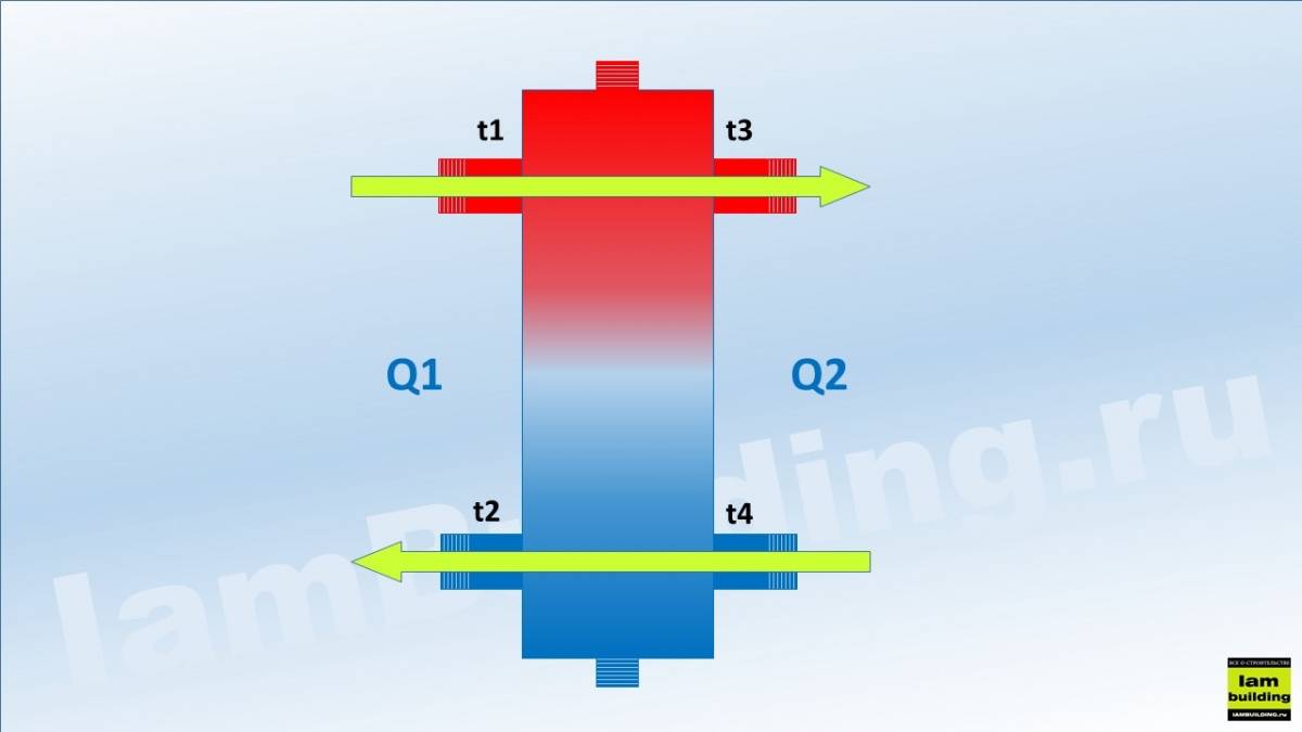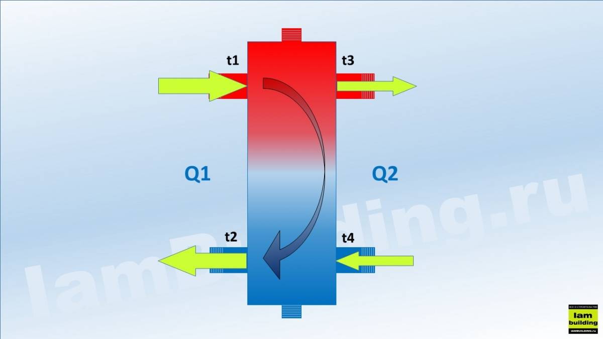 От котла (t1) будет поступать 40 литров теплоносителя нагретого предположим до 60˚С, но системе (t3) требуется 120 литров, в результате контур потребления заберет 40 литров с котлового контура и 80 литров с обратного контура. Но как все понимаем, теплоноситель с обратного контура возвращается не 60˚С как с котлового, а предположим 40˚С. В результате на входе потребительского контура будет подача теплоносителя уже не 60 ˚С а замешается 60˚С и 40˚С в долевом соотношении поступающего литража 40 и 80 и на подаче будет порядка 46-48 градусов.