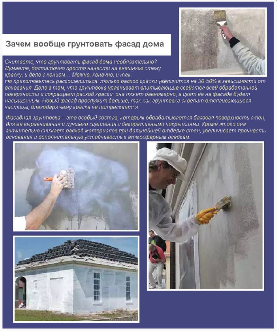 Для обработки фасадов рекомендуется выбирать грунтовку с водостойкими свойствами и устойчивую к температурным перепадам.