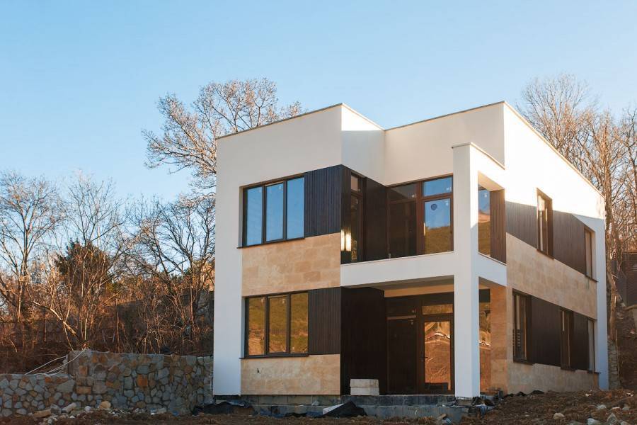 Геометрический. Очень популярное направление. У таких домов необычный вид, нестандартные пропорции. Форма куба — самый простой вариант. Тут больше приветствуются сложные конструкции из разных модулей. Для отделки выбираются современные материалы, фасад тщательно освещают. Коммуникации скрываются внутри здания, стены однотонные и гладкие.