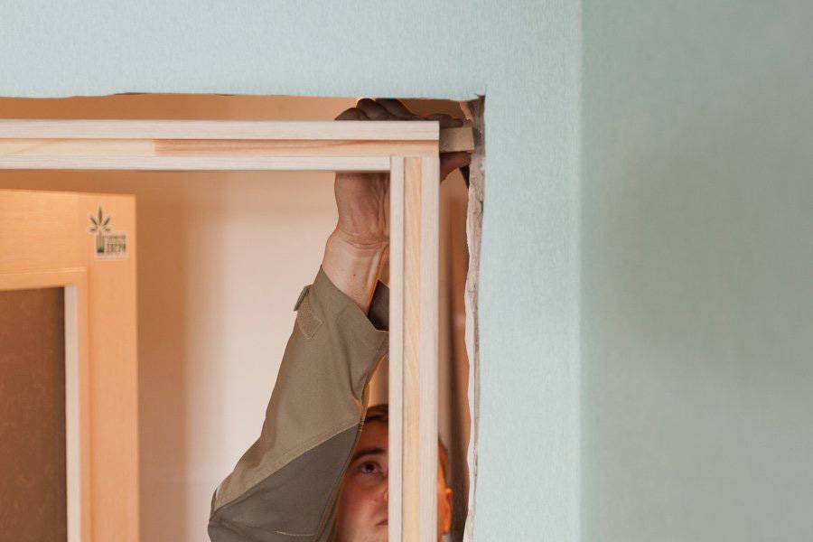 Полезные советы по сборке и установке начинаются с уборки старых наличников и очистке зазоров между дверью и проемом, снятию дверного полотна. Для этого необходимо выпилить две поперечных дырки насквозь сверху вниз. Затем вынимают вертикальные части старой дверной коробки. Можно использовать лом, если не хватает собственной силы. Чтобы верхний брус не мешал монтажу изделия, его снимают таким же образом.